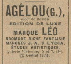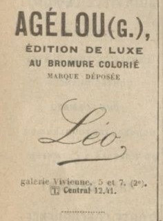 By 1918 his brother George had founded the business G Agélou, with marque G.A. and later the Lydia, and Léo marques. There are many photos of nudes under all these various marques. Jean found models and took photographs for the new company. Meanwhile the JA marque and premises were taken over by R. Bessan, see the directory entry.