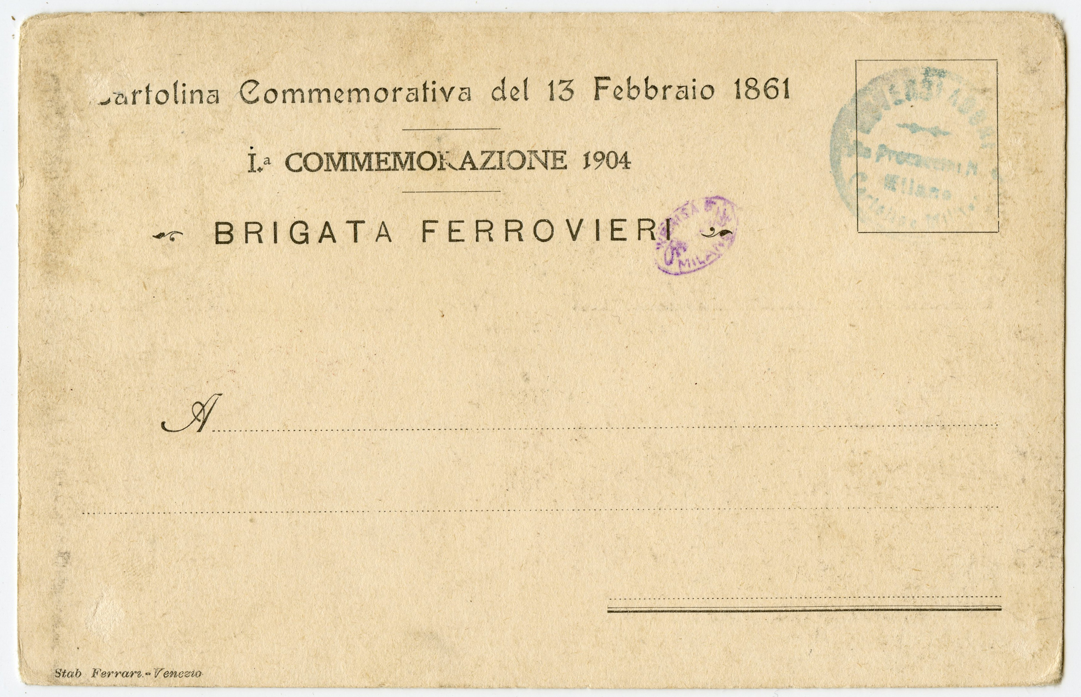 There are sepia views of Venice and reproductions of paintings published at about the same time marked ED.CARLO FERRARI . VENEZIA. This seems likely be the same publisher: an advertisimg card for a restaurant with the mark C Ferrari Venezia has, down the left side of the address side: "NB. Su questo lato si scrivere il solo indirizzo" while a a coloured figure card marked Stabl. Ferrari Venezia has in this place "NB. Sul lato anteriore della presente si scrive soltanto l'indirizzo."