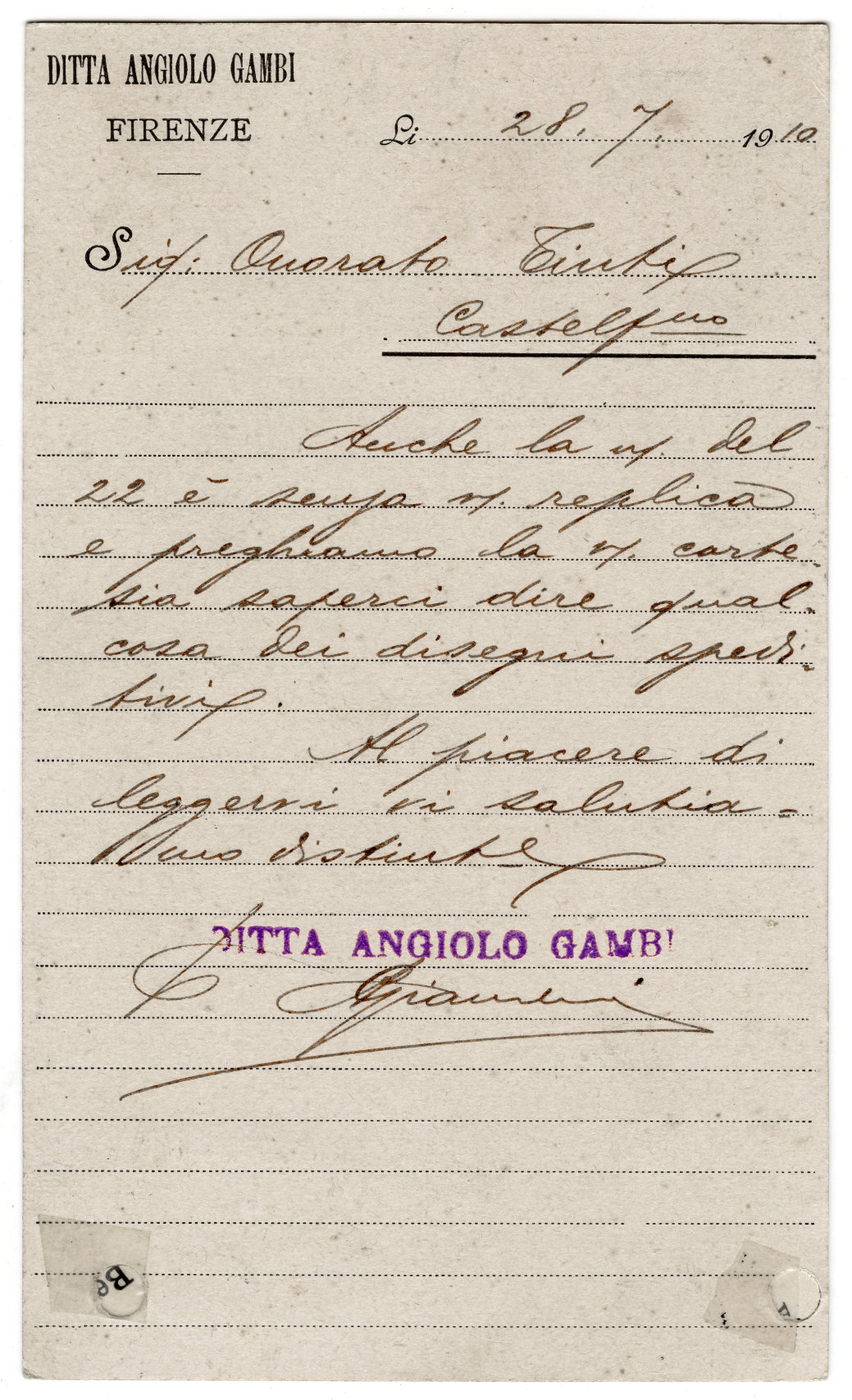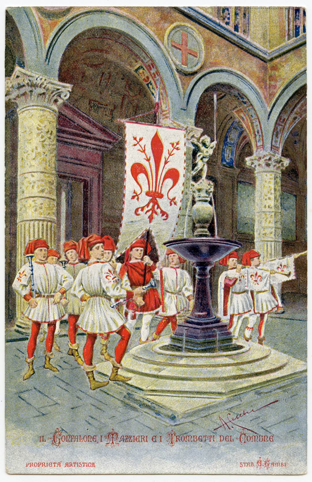 The second example card was produced to sponsor/advertise the public dormitory in Florence for the needy and homeless. Instead of the lettering used in the logo of this card, some cards have A Gambi in ordinary type. By the 1920s this firm was Stab. Litografico Benelli & Gambi, at the same addresses.