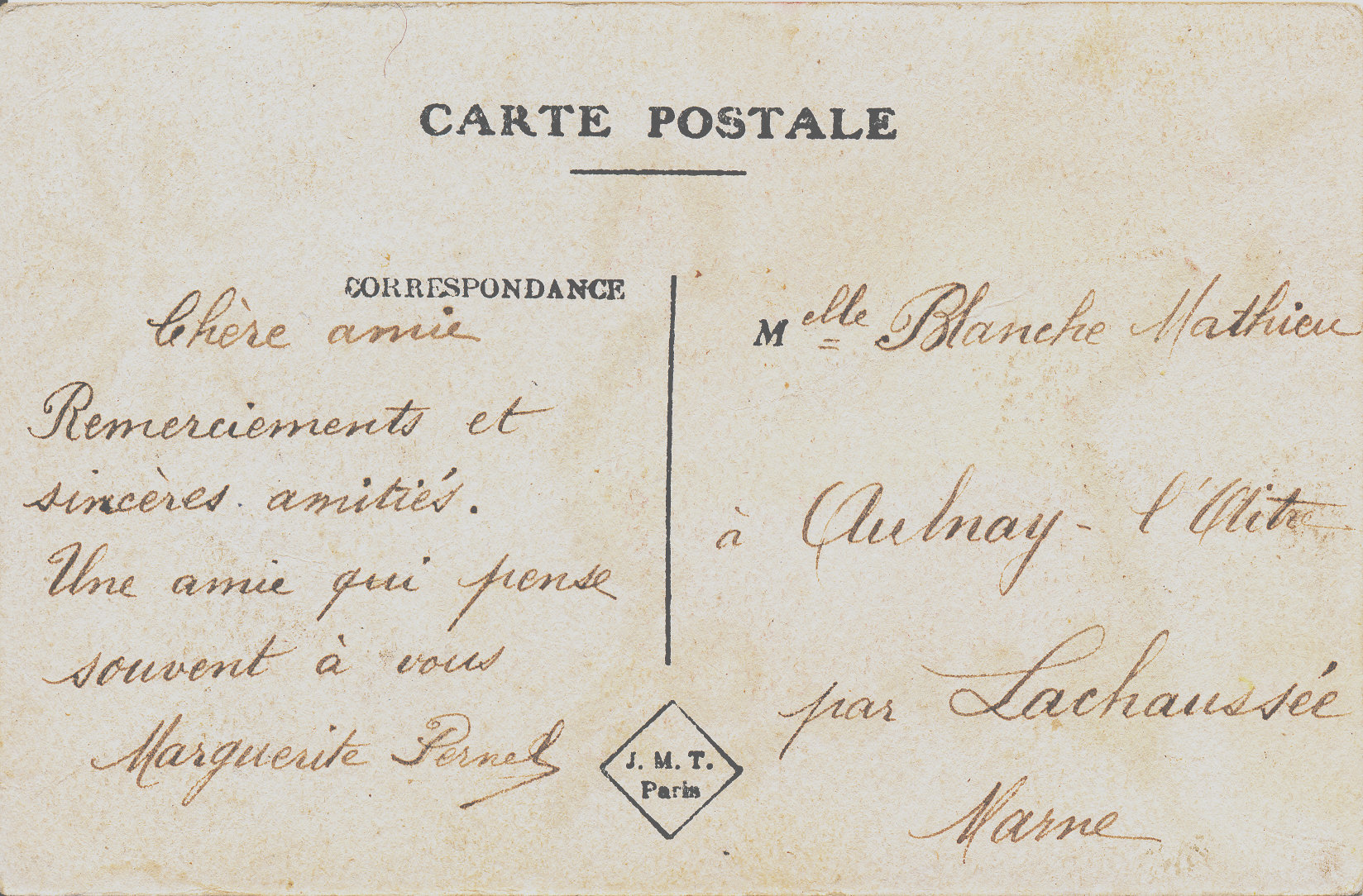 During WW1 JMT produced a number of Patriotic cards with the diamond logo. The second example card commemorates the first battle of the First World War. The siege of Liège was from 5 to 16 August 1914 and held up the German invasion of France. Liège was awarded the French Légion d'honneur in 1914. Later WW1 cards use the graphic letters JMT without the Paris. Some of wartime cards have on the address side the crest of the Chambre, and others printers' names Artige Aubenas or M Hanouart Nanterre.