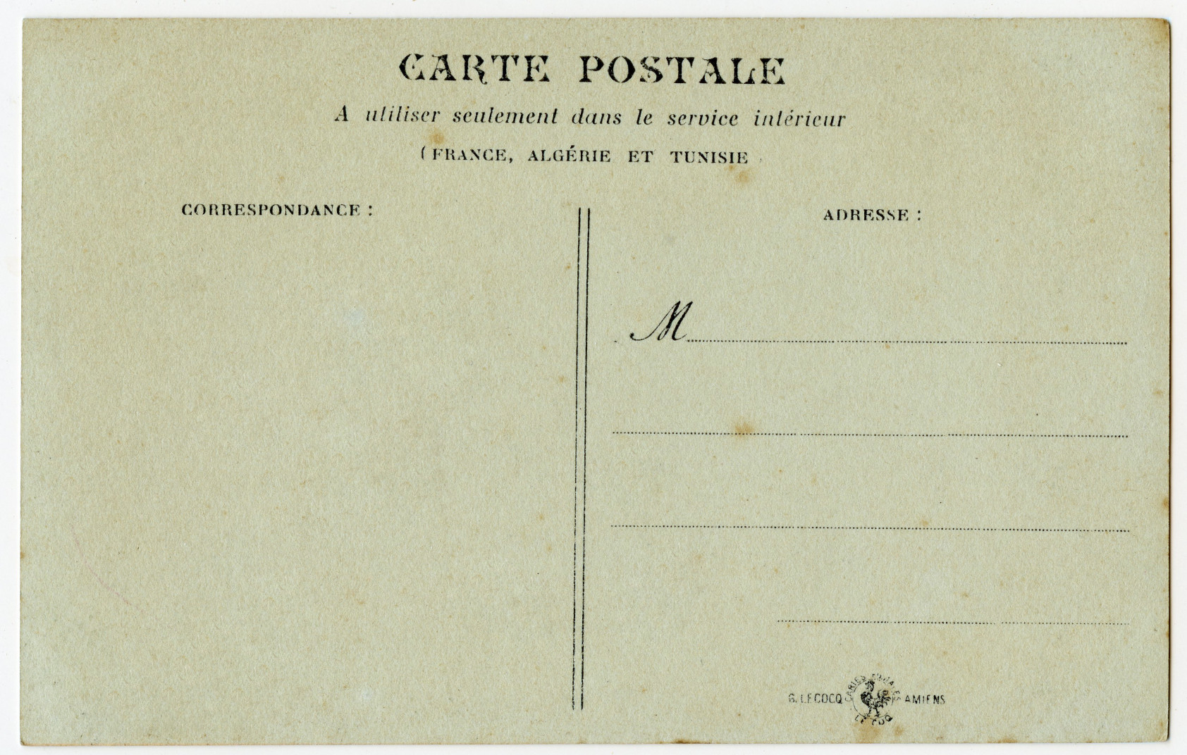 The name Le Coq, LeCoq, Lecocq is common in Amiens so this must represent a local firm, but it seems unlikely that it will have produced thousands of photographic postcards of this type by itself, rather acting as a reseller.