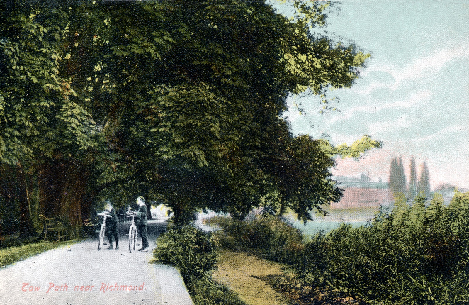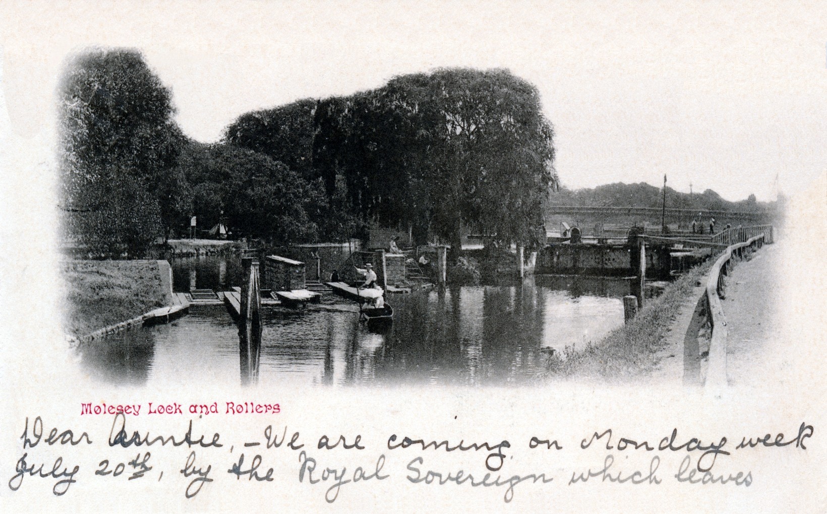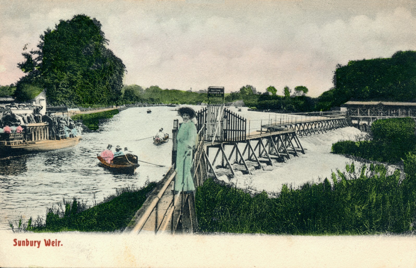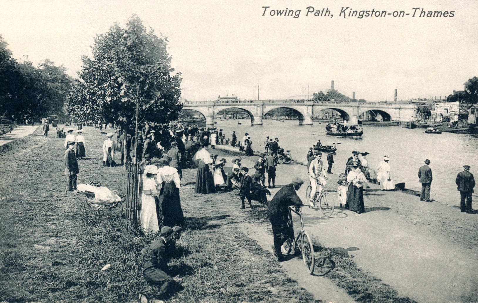 Teddington Lock,river view,paddle steamer,lady cyclist,